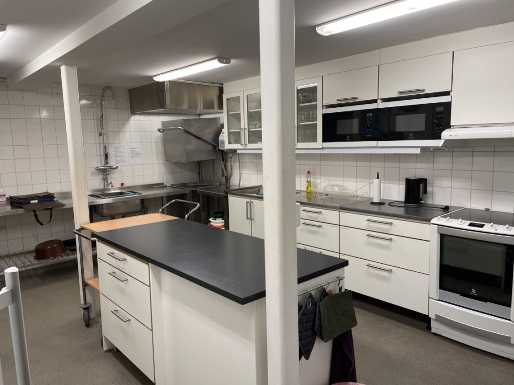 I rummet bredvid är det ett fullt utrustat kök. Köket är ungefär 5,7×3,9 m cirka 22 m2. Det är utrustat med 2 spisar, 2 mikrovågsugnar, diskmaskin för storhushåll och porslin (som tallrikar, karotter, kaffe- & tekoppar, muggar mm), glas samt bestick både för bak/matlagning och servering.